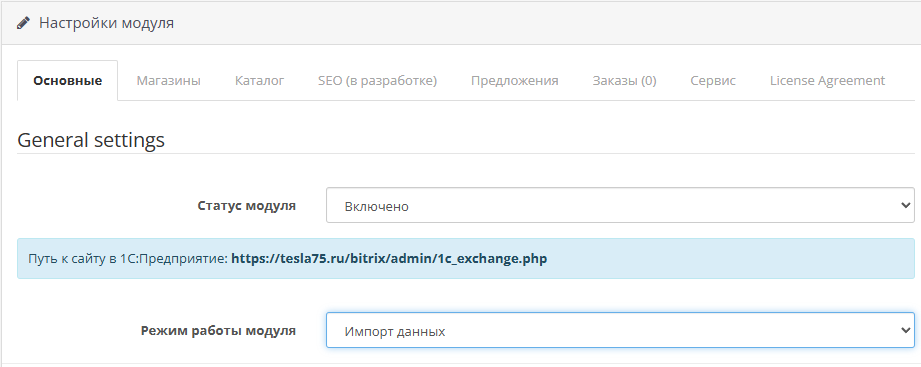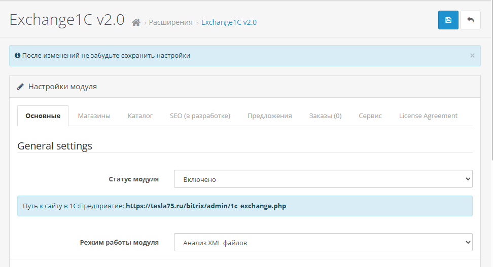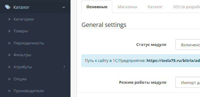 Теперь на вкладке «Основные» переведите режим работы модуля в импорт данных и сохраните настройки.