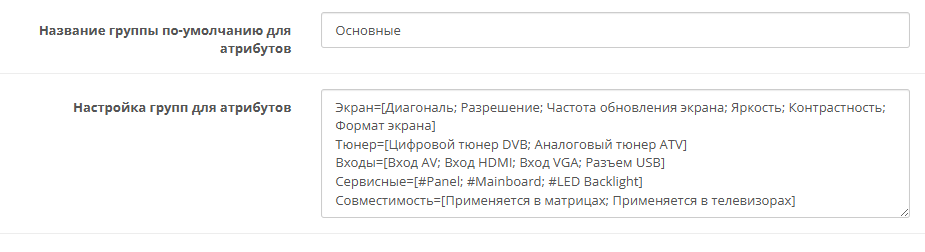 Во вкладке «Каталог» необходимо следовать выделенным красным цветом значения параметров, это рекомендуемые. Если сайт пустой то опуститесь до «Названия группы для атрибутов» и установите группу, например, «Основные», дополнительные группы можно назначить в поле ниже, на примере как у меня в тестовой базе