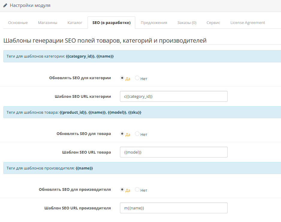 Модуль научился генерировать ссылки на категории, товары и производителей по шаблону, но можно отключить и пользоваться сторонними модулями. Можно использовать в тексте кириллицу, при обработке модуль уберет все спецсимволы, пробелы и произведет транслитерацию. Если при генерации модуль обнаружит дубликат, то добавит в конец нижнее подчеркивание и порядковый номер дубляжа _X