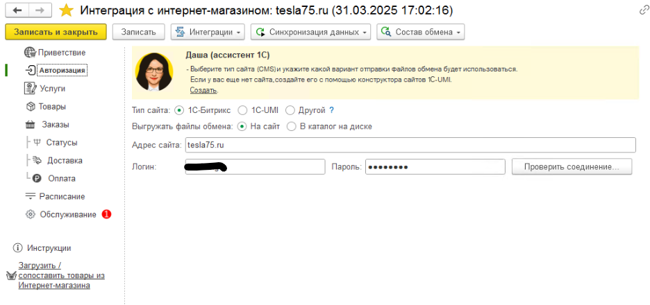 После того как на вкладке основные все настроили, сохраните настройки и переходим в 1С для настройки синхронизации с сайтом. В 1С я не буду приводить пример так как существуют разные версии, но принцип один, указываем сайт, логин и пароль, который прописали в модуле обмена, если старая версия 1С то нужно указать путь к сайту (взять его можно в настройке модуля) и проверить подключение.