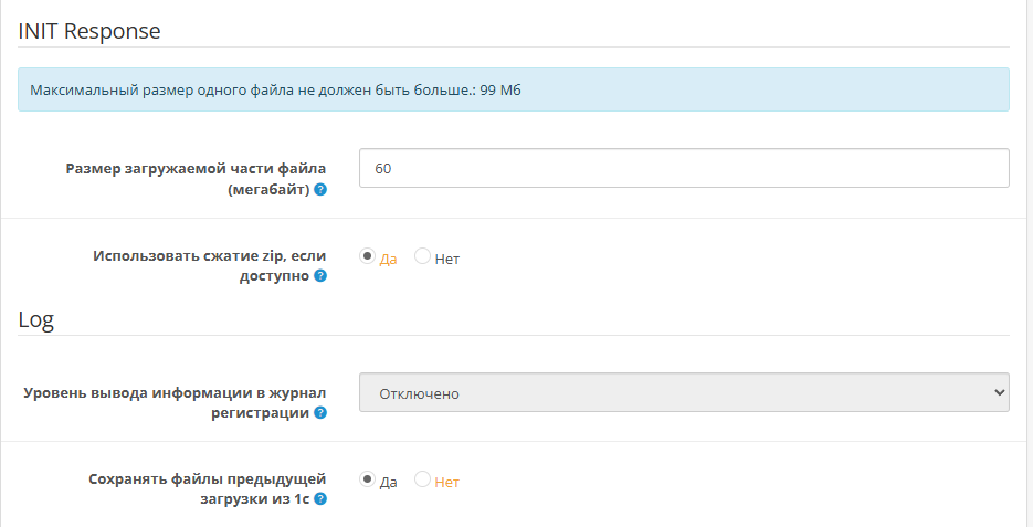Размер загружаемой части файла установите сначала небольшой, он влияет на загрузку архива ZIP, при достижении порога, 1С будет резать его на равные части. Но при обмене больших данных и при полном обмене 1С может нарезать несколько тысяч мелких кусочков. Я рекомендую устанавливать от 40 до 100 мегабайт, хотя все зависит от хостинга.