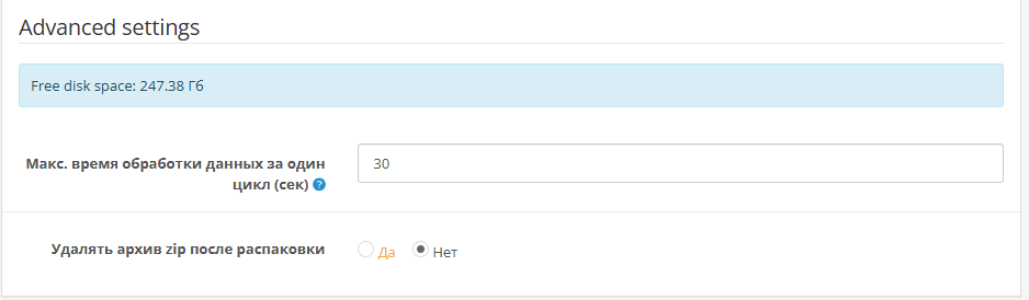 Далее ограничение времени работы php можно не трогать либо установить на 1 сек меньше чем в настройках php вашего хостинга, а также выключите удаление архива после распаковки, если включен у вас обмен через ZIP, иначе это неактуально. После первого обмена нужно включить удаление архива, иначе место на диске быстро будет заканчиваться.
